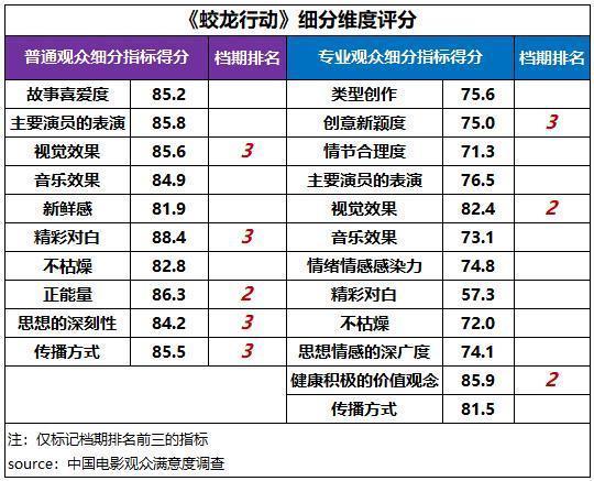 从细分维度来看,在普通观众评价中,《蛟龙行动》的正能量得分居档期第二位,视觉效果、精彩对白、思想深刻性和传播方式得分都居第三位;专业观众评价中,视觉效果、健康积极的价值观念得分居第二位,创意新颖度居第三位。